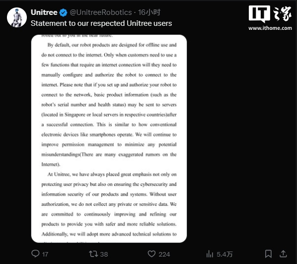 宇树科技表示,默认情况下,其机器人产品设计用于离线使用,不会连接到互联网。只有当客户需要部分功能时,才需要手动配置并授权机器人连接互联网。在连接网络后,机器人的序列号、健康状态等基本产品信息可能会被发送到服务器,这与智能手机等电子设备的运行方式类似。公司将继续改进权限管理,以尽可能减少潜在误解。